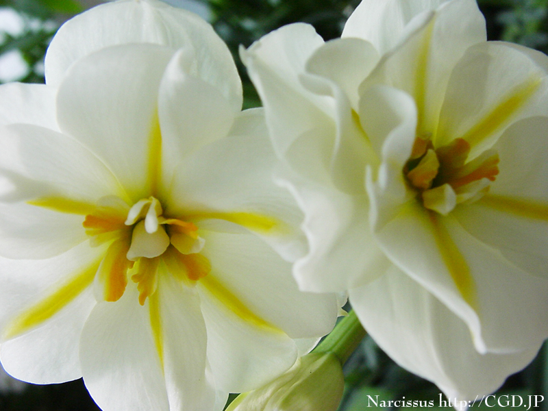 ご覧の品種は八重のもので、一番ポピュラーな日本水仙とはひと味違い、清楚な水仙の趣と、まるでプルメリアのような黄色のラインのはいった花びらのひろがりが同居するなんとも美しい水仙です。